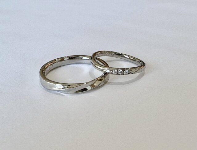 リング中央の斜めのカットが光をさりげなく反射するデザインで