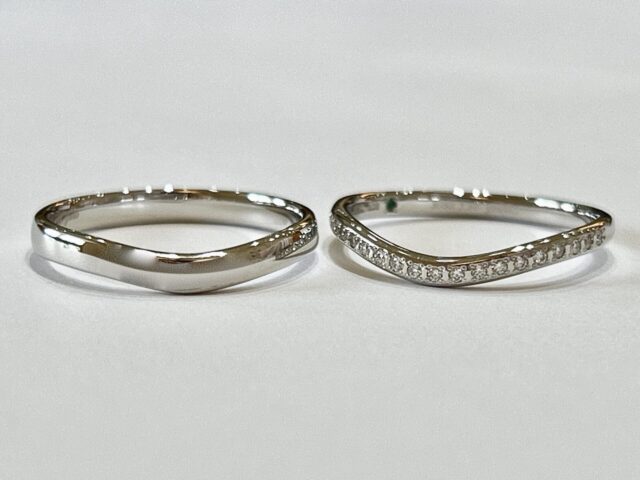 こちらの【CARNE】はゆるやかなV字ウェーブに等間隔で並んだダイヤモンドがキラキラと輝いて本当に可愛いリングなのです。華やかさプラスお指もより綺麗に見えます。メンズは一見細身なのですが程よい厚みがあり手の大きい男性にもよく似合います!