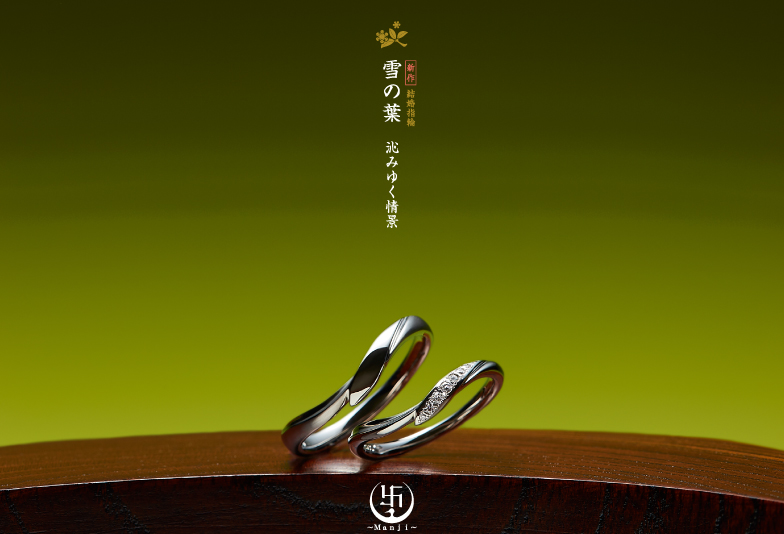 葉や枝が雪を支えているよう様を結婚するお二人に比喩した結婚指輪です