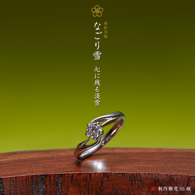 なごり雪という花を雪の結晶にも見えるようにデザインされた婚約指輪