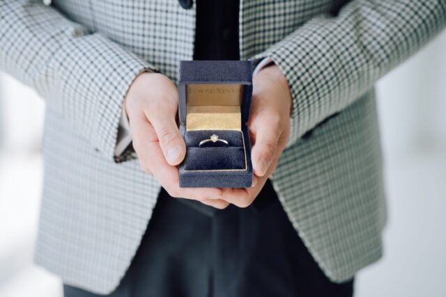 パカっとケースが開けられ輝くエンゲージリングは