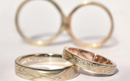 400年の歴史を誇る幻の伝統技法を形に。江戸時代に考案された「幻の技術」木目金(杢目金)の結婚指輪・婚約指輪。色の異なる金属を幾重にも重ね合わせ、丹念に彫って鍛え、美しい木目の文様を作り出していきます。【世界にひとつだけの】リングを。