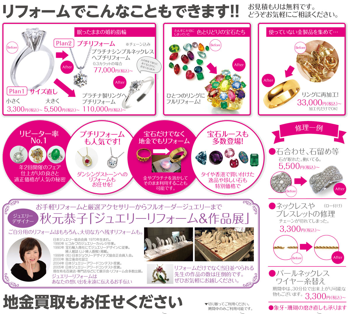 定期的にジュエリーデザイナーが来店するフルオーダーリフォームフェアも開催いたしております。